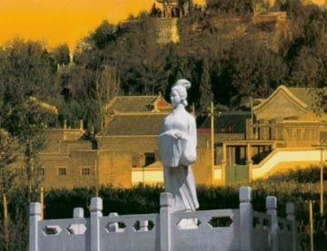 姜女廟景區是一個園林,有小橋流水,綠柳紅花,蜿蜒前進,有一座主山,不高,108級臺階直通山門,山頂是孟姜女的祭祀廟,有著著名的長聯。其中有孟姜女的雕像,近代的還是寧靜堅強美好的女子形象;早些敘述故事的一組組雕像,基本就是會意吧,用美的標準去衡量,算是“慘不忍睹”的,幾年沒去了,不知道有沒有拆掉。山后的園林,有幾株古樹,用來祈福,許愿愛情,據說靈驗.